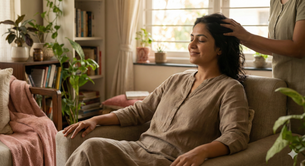 Head massage stimulates nerve endings and promotes relaxation. In traditional households, this ritual often symbolized care and bonding. The gentle circular motion reduces scalp tension, which can accumulate due to stress, screen time, and long work hours.
