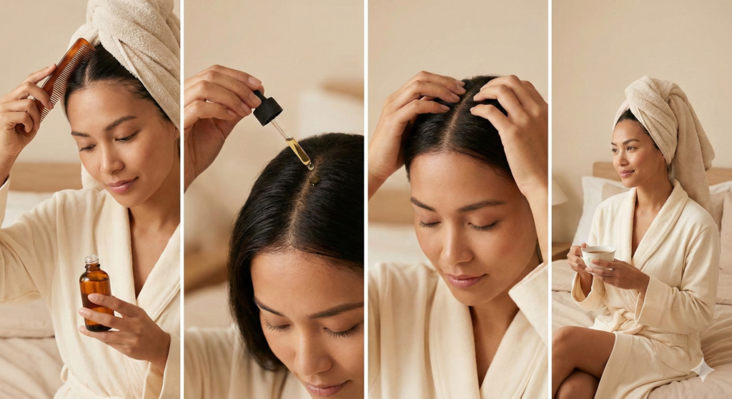 Stress is one of the contributing factors to temporary hair shedding. While oil massage alone does not “cure” hair fall, creating a calming routine supports overall scalp balance.